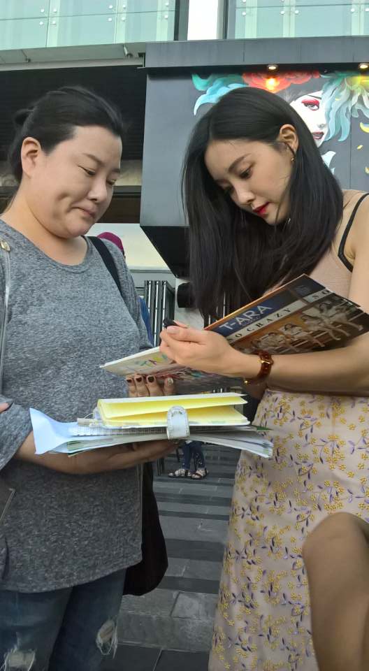 Thành viên T-ARA tỉ mỉ kí tặng và trả lại sổ tay cho người hâm mộ.