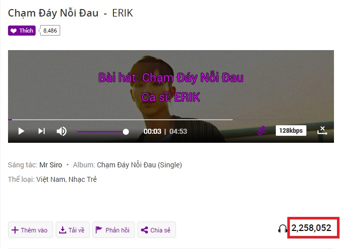 Thành tích hơn 2 triệu lượt nghe trên một trang nhạc trực tuyến chỉ sau 1 ngày.