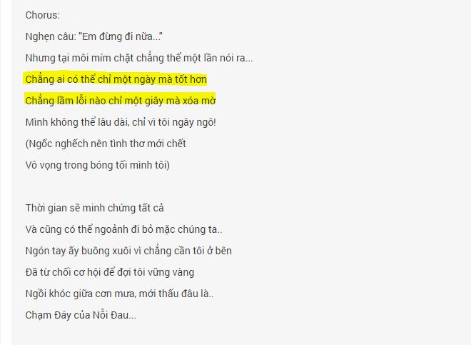 Cũng ở buổi livestream, Erik cho biết trong ca khúc anh thích nhất câu hát: “Chẳng ai có thể chỉ một ngày mà tốt hơn. Chẳng lầm lỗi nào chỉ một giây mà xóa mờ”. Bởi đối với Erik, đây như câu hát an ủi bản thân vì trong tình yêu lỗi lầm là điều không thể tránh khỏi.