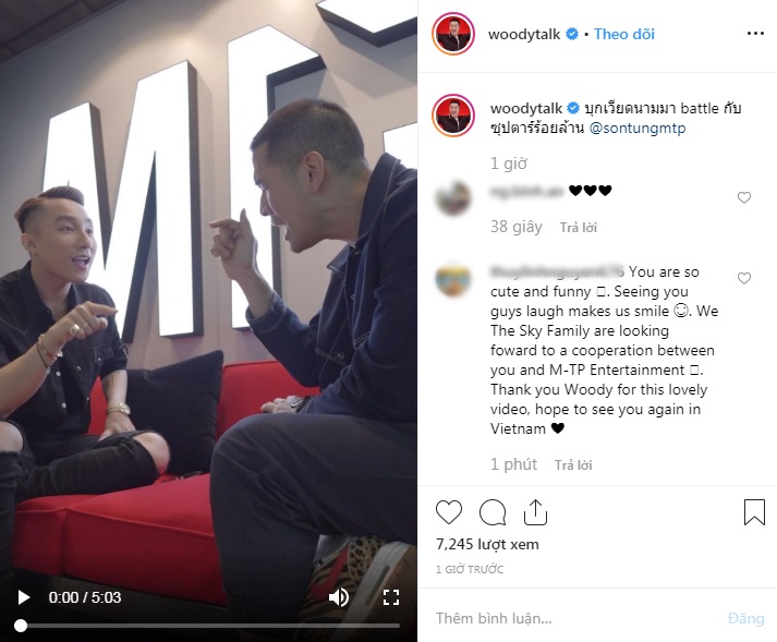 Cuối đoạn clip, Woody không quên dành lời cảm ơn đến Sơn Tùng M-TP và chia sẻ thật sự rất vui và tuyệt vời khi được làm quen một người tài năng như anh. Đáp lại tấm chân tình đó, Sơn Tùng cũng nói lời cảm ơn và hẹn gặp Woody một ngày không xa ở Bangkok.