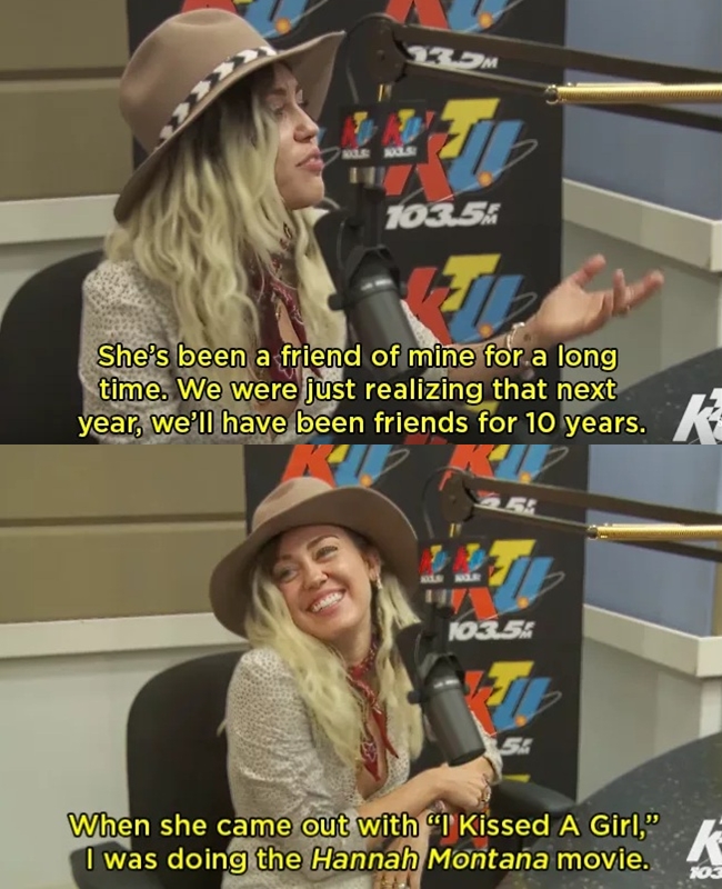Mới đây trong một cuộc phỏng vấn, Miley Cyrus đã có những chia sẻ về tình bạn lâu năm với Katy Perry. Hai ngôi sao nổi tiếng bắt đầu chơi với nhau vào thời điểm Miley vẫn là ngôi sao sáng giá của Disney. Và đó cũng là lúc Katy phát hành ca khúc I Kissed A Girl đình đám. Miley cho biết cô đã cực hoảng hốt khi tình cờ nghe được lời thú nhận của Katy Perry trên radio rằng bản hit này viết về mình.