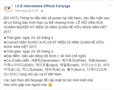 Tất cả những thông tin được ghi nhận tính đến thời điểm này đều đến từ fanpage của một nhóm nhạc mà chắc hẳn nhiều Kpop fan lần đầu nghe đến: I.C.E - hoạt động tại Hàn Quốc và sắp debut tại Việt Nam. Được biết, công ty quản lý của I.C.E - HS Entertainment cũng là công ty quản lý nhóm M-Tiful, đồng thời là một trong những bên tổ chức sự kiện lần này.