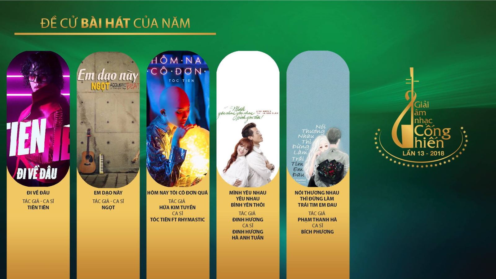 Các đề cử chính thức cho tất cả hạng mục tại giải thưởng Cống Hiến 2018 đã được hé lộ với sự tranh tài khá gay cấn giữa các bảng đấu, khi ứng viên nào cũng “kẻ tám lạng, người nửa cân”. Hãy cùng SAOstar điểm qua danh sách đề cử của 3 hạng mục đầu tiên gồm: MV của năm, Bài hát của năm, Nhà sản xuất của năm và các khán giả hãy cùng thử trổ tài “cầm cân nảy mực” chọn ra cái tên nào được dự đoán sẽ dành chiến thắng.