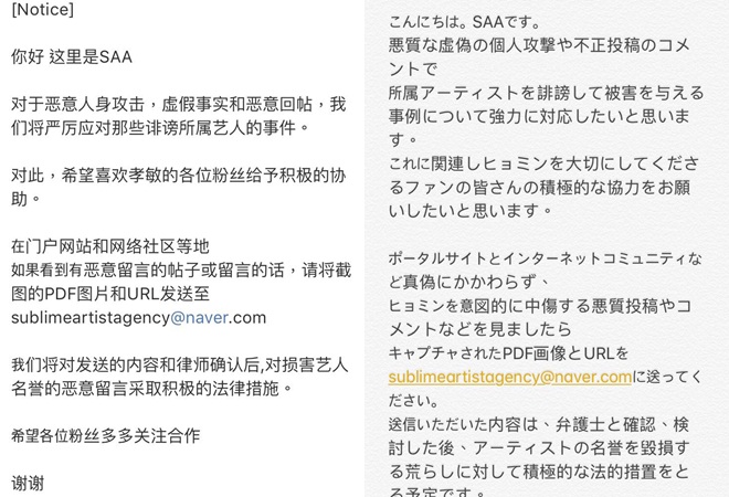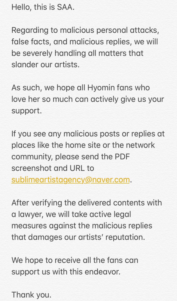 Mới đây, đại diện Sublime Artist Agency - công ty quản lý hiện tại của Hyomin (thành viên nhóm nhạc nữ T-ara) đăng tải một thông báo liên quan đến hành động pháp lý đối với những đối tượng bôi nhọ, thù hét, tung tin đồn thất thiệt đối với nữ nghệ sĩ. Cụ thể, phía này yêu cầu fan cung cấp thông tin, thu thập bằng chứng về các đối tượng có hành vi kể trên để có biện pháp xử lý thích đáng.