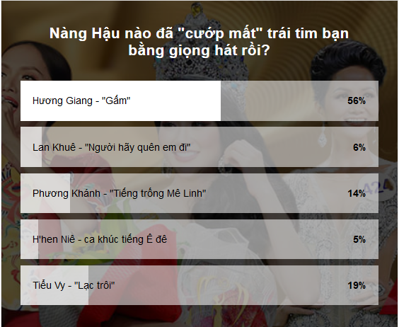 Trong bài viết Bên cạnh nét đẹp trác tuyệt, khi các nàng Hoa hậu cất cao tiếng hát sẽ như thế nào? SAOStar đã giới thiệu đến độc giả những nàng Hoa hậu sở hữu giọng hát tuyệt đẹp và những khoảnh khắc họ phô bày giọng hát của mình trước khán giả. Kết thúc bài viết, đã có một bảng khảo sát nho nhỏ, để tìm hiểu rằng: Nàng Hậu nào đã “cướp mất” trái tim của bạn bằng giọng hát? Và đây chính là kết quả đầy bất ngờ!