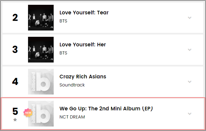 Album We Go Up đang nắm giữ vị trí thứ 5 trên BXH World Albums - xếp hạng những album âm nhạc quốc tế có doanh số cao nhất theo số liệu thống kê bởi Nielsen Music. Hiện tại, NCT Dream là nghệ sĩ thứ 2 bên cạnh BTS đang lọt vào top 5 của BXH này. Không chỉ vậy, We Go Up: The 2nd Mini Album còn “an tọa” ở vị trí thứ 7 trên Heatseekers Albums (BXH đánh giá doanh số bán hàng của những nghệ sĩ mới và có triển vọng trên Billboard).