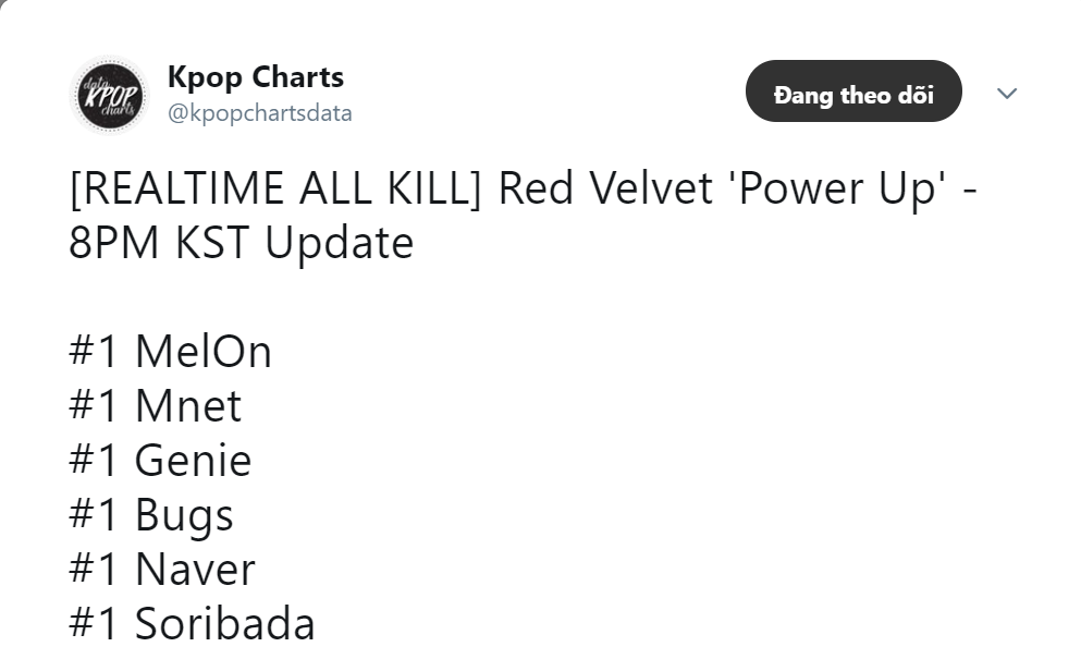 Chiều hôm nay (6/8), 5 cô nàng Red Velvet đã chính thức tái xuất “đường đua” Kpop sau một thời gian dài thả thính các fan. Không làm người hâm mộ phải thất vọng, với giai điệu sôi động cùng phần hình ảnh màu sắc, tươi vui, MV Power Up mang đậm không khí mùa hè đang làm cả Kpop phải “náo loạn”. Và chỉ sau 2 tiếng phát hành, Power Up đã trở thành ca khúc đầu tiên trong sự nghiệp của Red Velvet đạt được chứng nhận AllKill.