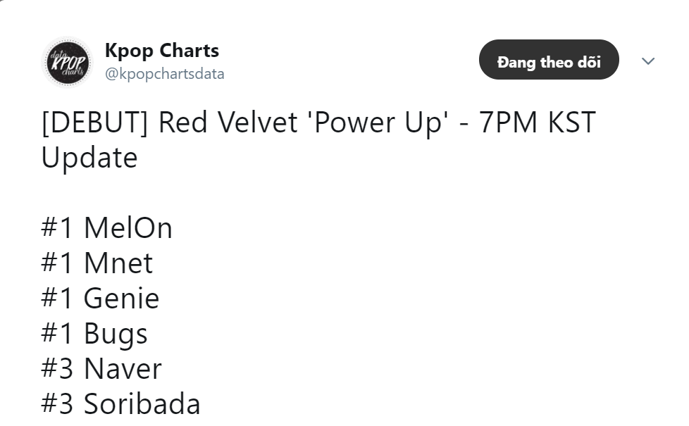 Đây là thứ hạng debut của Power Up, thiếu một chút nữa thôi thì ca khúc này đã có thể đạt AllKill ngay ở giờ đầu tiên.