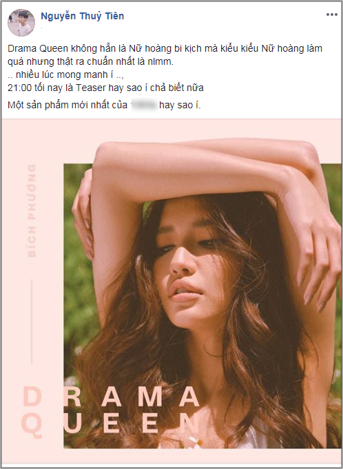 Sau 5 tháng tung hoành với siêu hit Bùa yêu, ngày 21/10 tới đây, Bích Phương sẽ chính thức trở lại đường đua V-Pop với sản phẩm mang tên Drama Queen. Trước đó, nữ ca sĩ cũng đã cho ra mắt hình ảnh teaser MV vô cùng quyến rũ không hề có một chút nào “bi kịch” khiến người hâm mộ lập tức “dính bùa”. Đặc biệt, ngay sau đó, nhạc sĩ Tiên Cockie đã đăng tải hình ảnh này lên trang cá nhân cùng lời trêu ghẹo Bích Phương là “nữ hoàng làm quá” vô cùng hài hước. Như vậy, sau biệt danh “thánh lầy”, Bích Phương tiếp tục có thêm một danh hiệu mới là “nữ hoàng làm quá” của V-Pop.