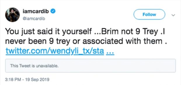 Chuyện sẽ không có gì đáng nói nếu như biên bản lời khai của anh chàng không xuất hiện tên của một trong những nữ rapper đình đám nhất hiện nay - Cardi B với tư cách một thành viên thuộc băng nhóm tội phạm Nine Trey Bloods. Ngay lập tức, cả bản thân cô nàng và ejip quản lý đã lên tiếng phủ nhận cáo buộc này. Trong một dòng tweet thanh minh, bà mẹ một con tự nhận bản thân là một là một thành viên của nhóm Brims chứ không phải như những gì 6ix9ine tố cáo.