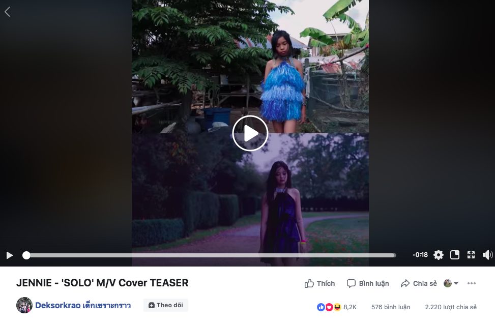 Và mới đây nhất, Deksorkrao đã chính thức tách lẻ một thành viên để… “debut solo”, với ca khúc Solo của cô nàng Jennie (BlackPink). Đoạn cover lại teaser vừa được đăng tải của Deksorkrao ngay lập tức đã thu hút sự chú ý của cư dân mạng về lần tái xuất này. Vẫn là những khung cảnh “cây nhà lá vườn” quen thuộc, thế nhưng biểu cảm thần thái không thua kém chủ nhân bản gốc cùng góc máy giống đến 90%, đoạn teaser phiên bản “nhái” hiện đã thu về hơn 8 nghìn lượt thích, 2 nghìn lượt chia sẻ trên Facebook. Hứa hẹn khi tung “MV chính thức” sẽ tiếp tục là một bản cover gây bão mạng xã hội trong thời gian tới.