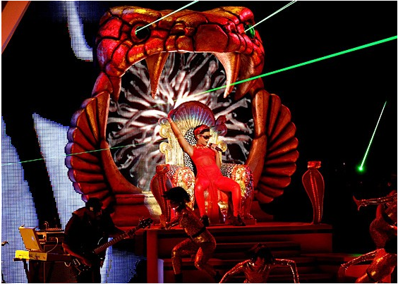 Hình tượng rắn hổ mang chúa không phải là độc quyền của Taylor Swift. Trở lại những năm tháng khi Rihanna còn mặn mà với âm nhạc, cô đã mang đến khán giả tại VMAs 2012 một sân khấu không thể nào quên. Giữa không gian réo rắc tiếng nhạc mang âm hưởng Ấn Độ, “bad girl” của chúng ta xuất hiện trong màn đêm, trên một chiếc ngai hình rắn hổ mang đầy ngoạn mục để biểu diễn ca khúc Cockiness (Love It) rồi sau đó chạy xuống cùng hát We Found Love với khán giả.