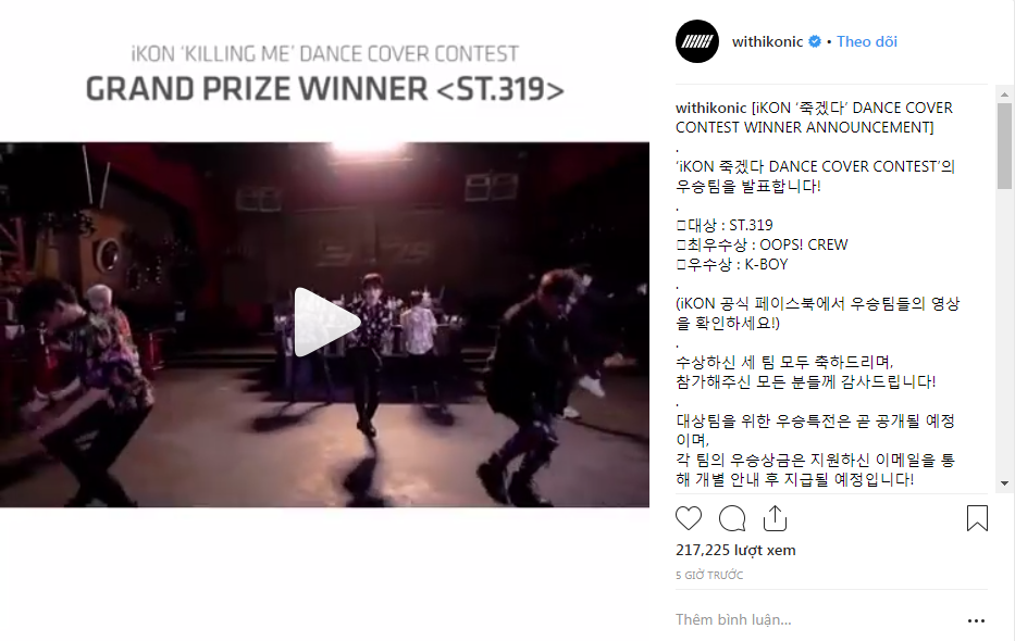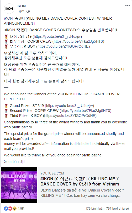 Sau thời gian bầu chọn, mới đây, trên trang facebook chính thức của iKON đăng tải thông báo về chủ nhân của clip giành chiến thắng cuối cùng - ST.319. Nhóm nhảy Việt Nam gây ấn tượng bởi video Dance cover với sự đầu tư công phu, màu sắc khá giống với phiên bản gốc, đặc biệt là phần vũ đạo điêu luyện, thần thái tuyệt vời đánh bại mọi đối thủ.
