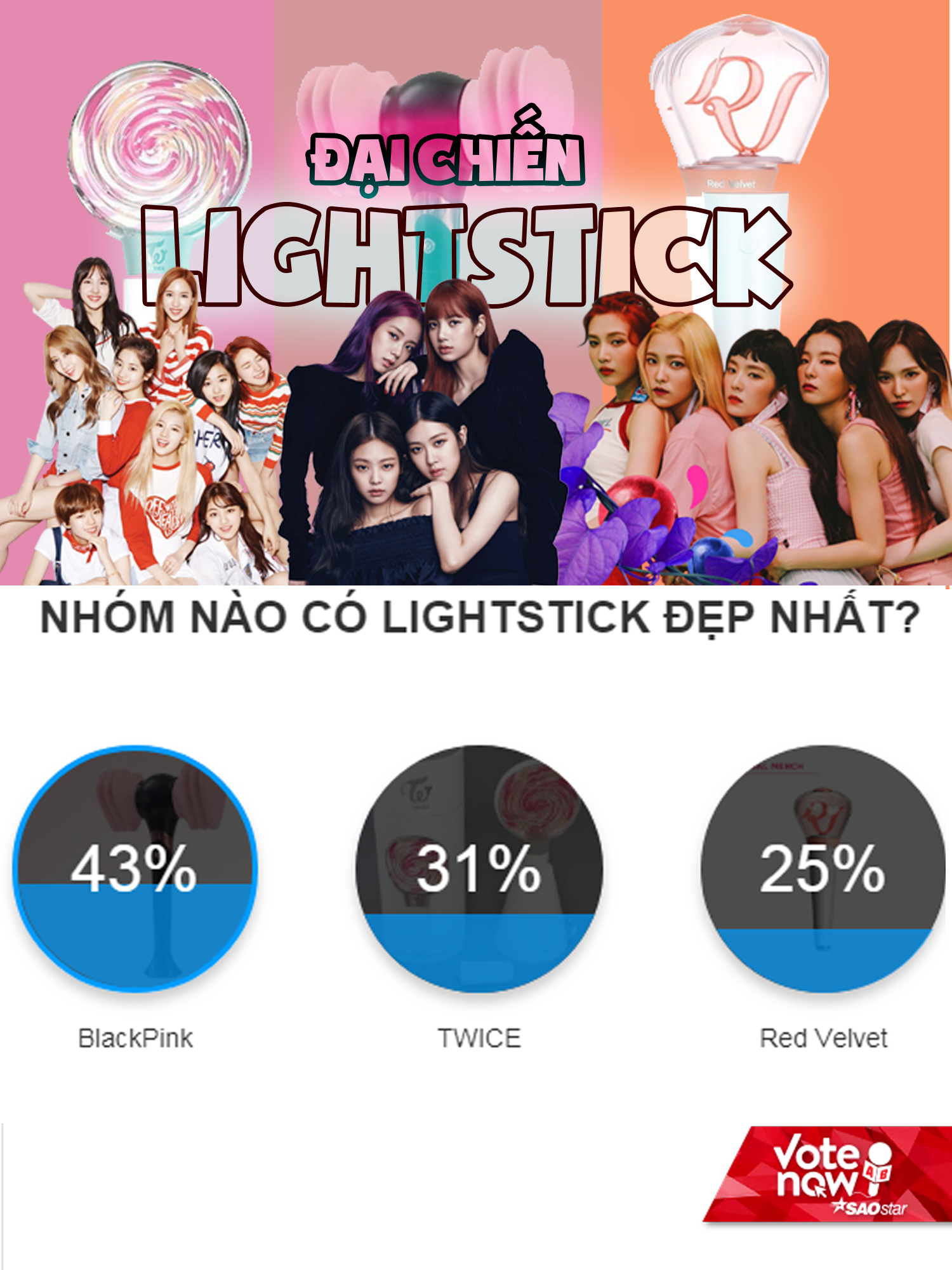 Ngày 2/8 vừa qua, Saostar đã có một cuộc thăm dò giữa 3 lightstick đến từ 3 nhóm nữ Big3 lần lượt là: Candy Bong của TWICE (JYP), Pyong Bong của Black Pink (YG) và Mandu Bong của Red Velvet (SM). Và cuối cùng, chúng ta đã có kết quả chính thức.