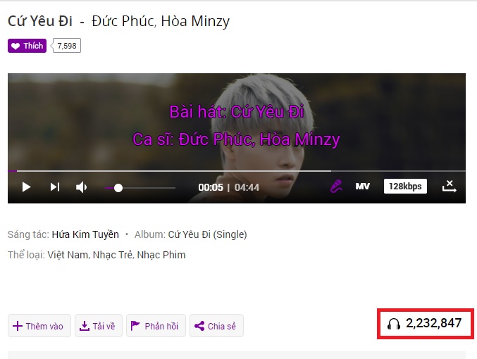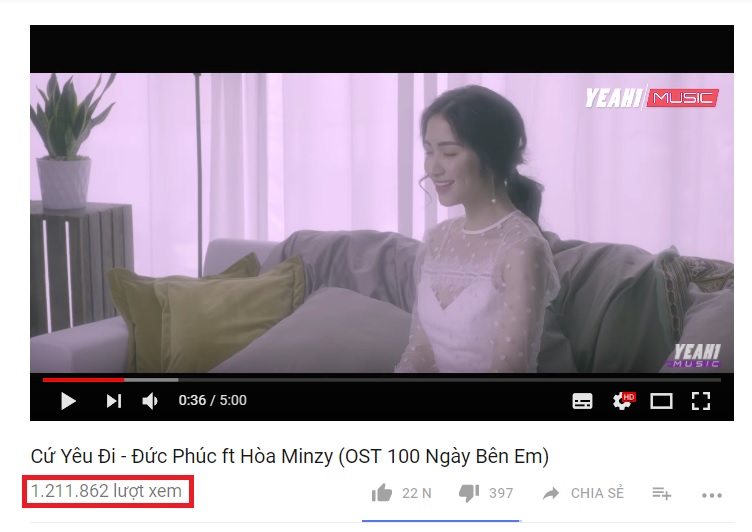 Tuy nhiên, trên mặt trận Youtube, MV Cứ yêu đi của cặp đôi cũng đạt thành tích khá tốt khi có hơn 1 triệu lượt xem sau 3 ngày ra mắt.