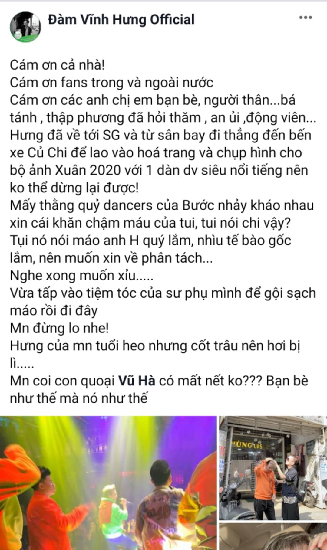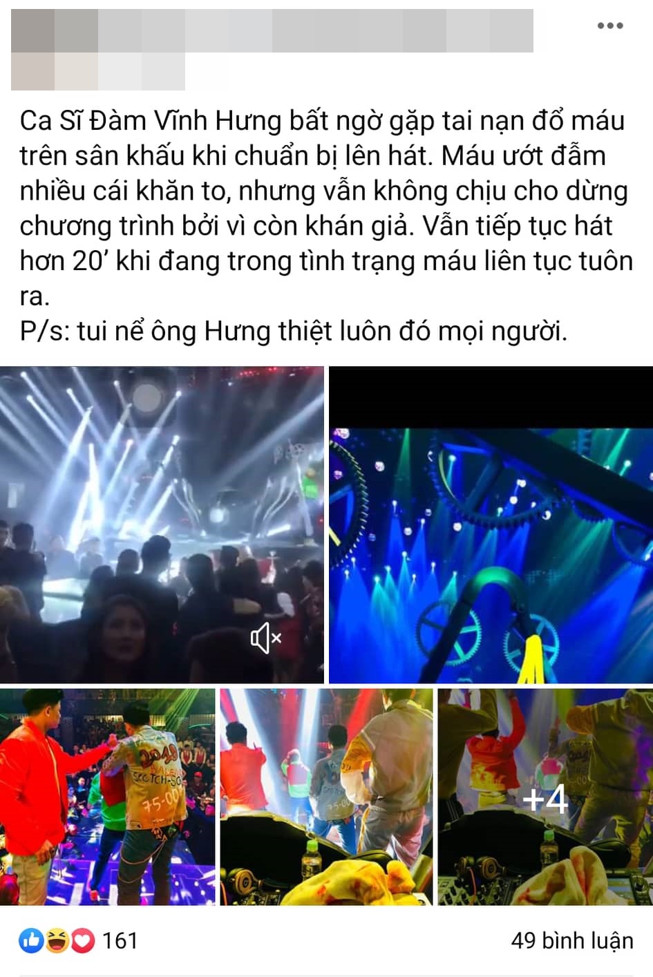 Bài đăng về việc Đàm Vĩnh Hưng gặp sự cố đổ máu trên sân khấu.