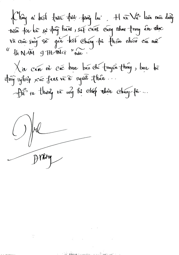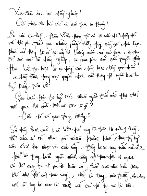 Mới đây, “ông hoàng nhạc Việt” đã viết một bức tâm thư bằng tay rất dài gửi đến công chúng và truyền thông. Theo đó, Đàm Vĩnh Hưng - Dương Triệu Vũ cùng nhau trải qua nhiều buồn vui, thăng trầm, đong đầy kỷ niệm ở cả âm nhạc và cuộc sống. Để rồi, cả hai quyết định cùng nhau viết lên những trang nhật ký âm nhạc trong suốt 14 năm 9 tháng qua.