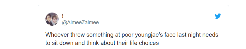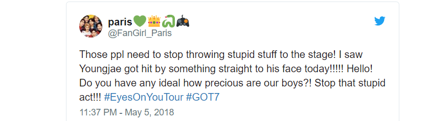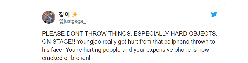 “Mọi người cần dừng lại việc ném mấy cái đồ ngu ngốc lên sân khấu đi. Tôi thấy YoungJae bị thứ gì đó đập vào mặt hôm nay. Các bạn có biết như thế nào là trân trọng các chàng trai không? Dừng cái hành động nguy hiểm đó lại ngay”.