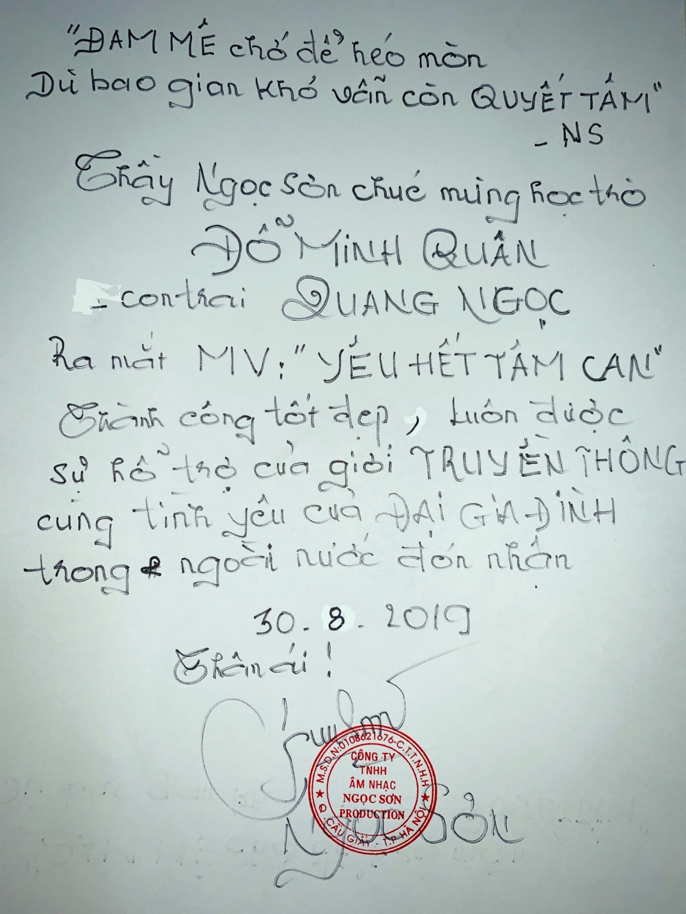 Lần này, khi Đỗ Minh Quân ra mắt MV, danh ca Ngọc Sơn cũng viết một bức thư tay rất chân thành và xúc động để chúc mừng học trò dù đang rất bận rộn với công việc. Điều này vô cùng đặc biệt thể hiện tình cảm của một người thầy, người cha đáng kính dành cho học trò và con trai của mình.