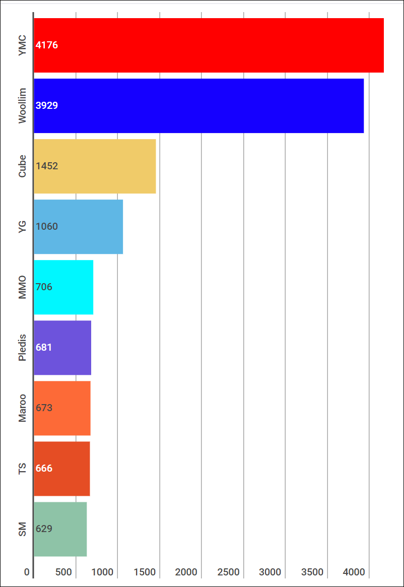 Với hàng ngàn lượt vote, 3 công ty giải trí đứng đầu trong danh sách này là YMC, Woolim và Cube Entertainment. 2 ông lớn YG và SM lần lượt xếp ở vị trí thứ 4 và thứ 9. Ông lớn còn lại trong BIG3 là JYP không có mặt trong bảng xếp hạng này.