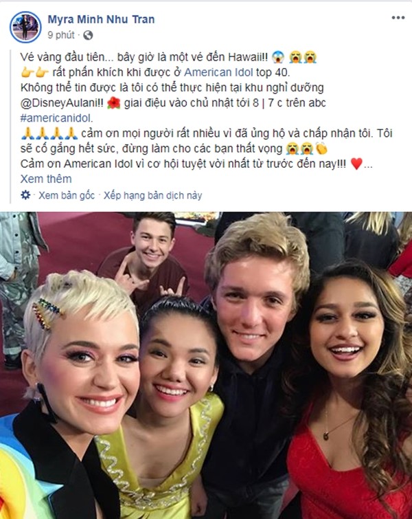 Sau khi gây ấn tượng với giám khảo cùng khán giả quốc tế trong vòng Audition American Idol 2019, Myra Minh Như đang ngày một chứng minh tài năng của mình khi cho đến thời điểm hiện tại, cô nàng đã lọt Top 40 giọng hát xuất sắc nhất. Trên trang cá nhân của mình, cô nàng không giấu nổi được sự sung sướng và hạnh phúc khi khoe thành tích của mình với người hâm mộ.