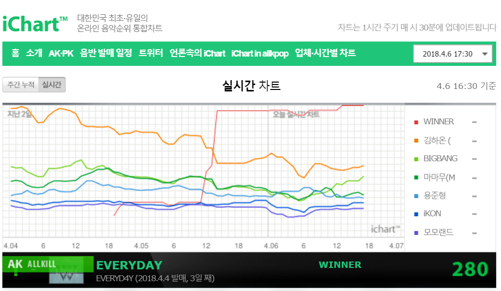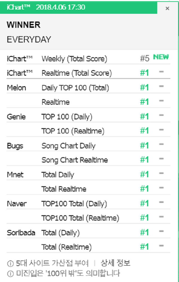 Đúng như những gì người hâm mộ kỳ vọng, album mới của Winner - EVERYD4Y cùng ca khúc chủ đề Everyday liên tục “công phá” các “đấu trường” âm nhạc trong và ngoài nước, tạo nên làn sóng khuấy đảo mặt trận Kpop đầu tháng 4. Thành tích đáng nể từ Everyday được cập nhật liên tục trên BXH tổng hợp iChart Hàn Quốc, mới đây nhất đã giúp Winner giành chứng nhận Certified All-Kill (CAK) đầu tiên trong sự nghiệp.