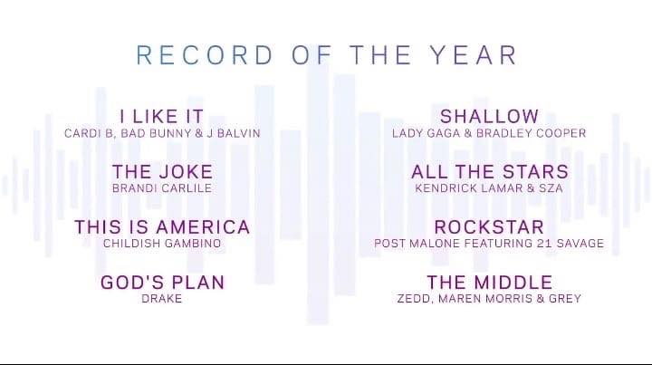 Không bất ngờ gì khi Invasion Of Privacy, Dirty Computer, Scorpion và Golden Hour lọt vào đề cử album của năm này đây khi các album này đều đã có một sự phủ sóng rất rộng tại Việt Nam chúng ta năm qua. Đi kèm cùng chất lượng đỉnh cao, chắc chắn hạng mục này sẽ là một cuộc chiến đổ máu của các đề cử đây.