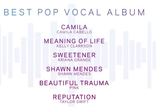 Album Shawn Mendes của Shawn Mendes dù bị chê tơi tả nhưng vẫn chiễm chệ trong hạng mục album pop xuất sắc nhất, Taylor Swift trượt hết big4 đề cử cũng hạ cánh an toàn tại hạng mục này. Đặc biệt, nó còn là sự xuất hiện lần nữa của Beautiful Trauma tại Grammys năm nay dù nó đã được đề cử vào năm ngoái rồi.