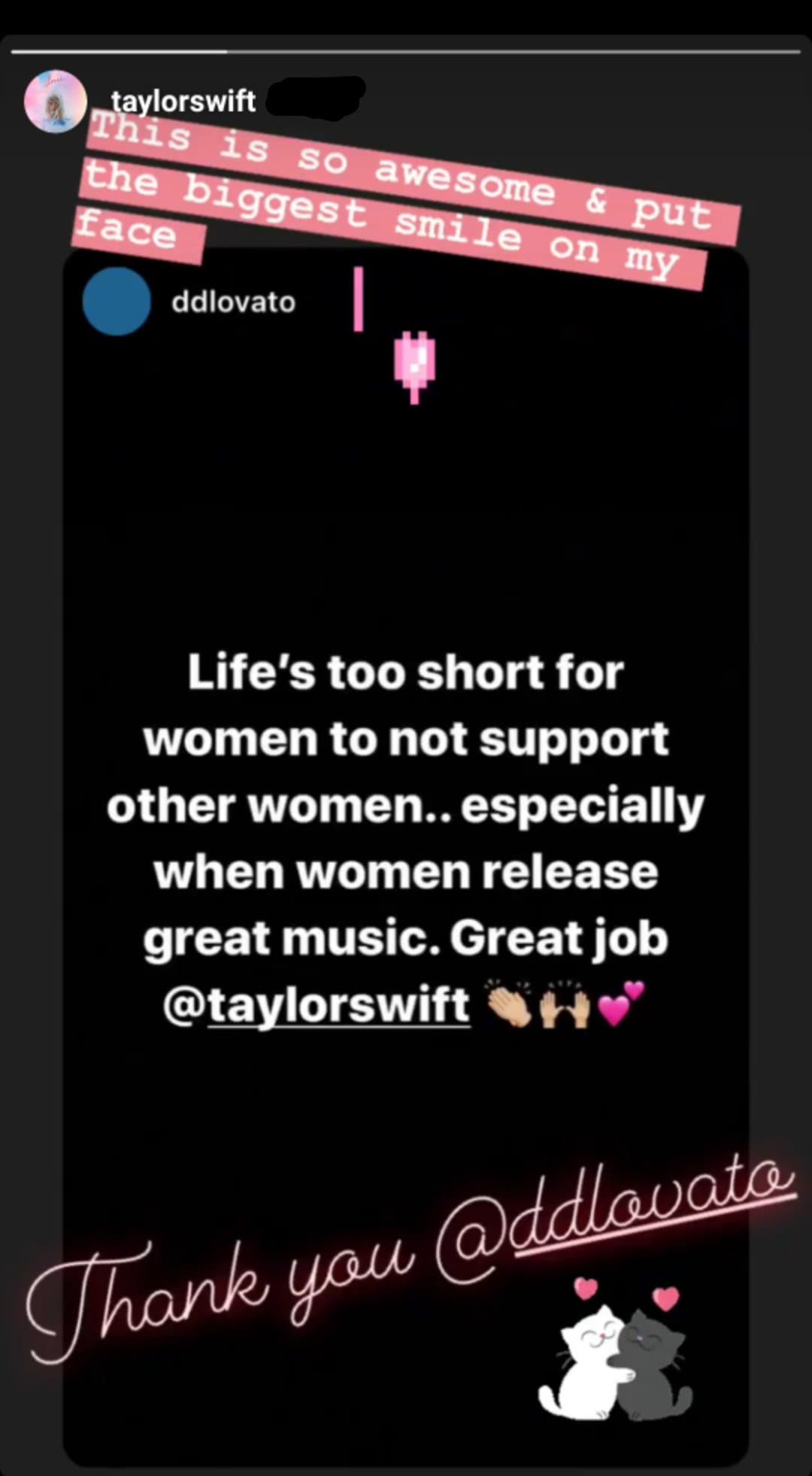 Demi Lovato sâu sắc chia sẻ: “Cuộc sống quá đỗi ngắn ngủi, vậy nên không có lý do nào những người phụ nữ không ủng hộ nhau. Đặc biệt là khi họ tạo ra thứ âm nhạc quá tuyệt vời”. Dòng story của Demi Lovato đã lập tức gây bão mạng xã hội vì không ai có thể tin vào mắt của mình. Demi Lovato công khai ủng hộ Taylor Swift ư? Lẽ nào cô nàng đã nhận ra quay đầu là bờ và quyết định làm lành với Taylor Swift?
