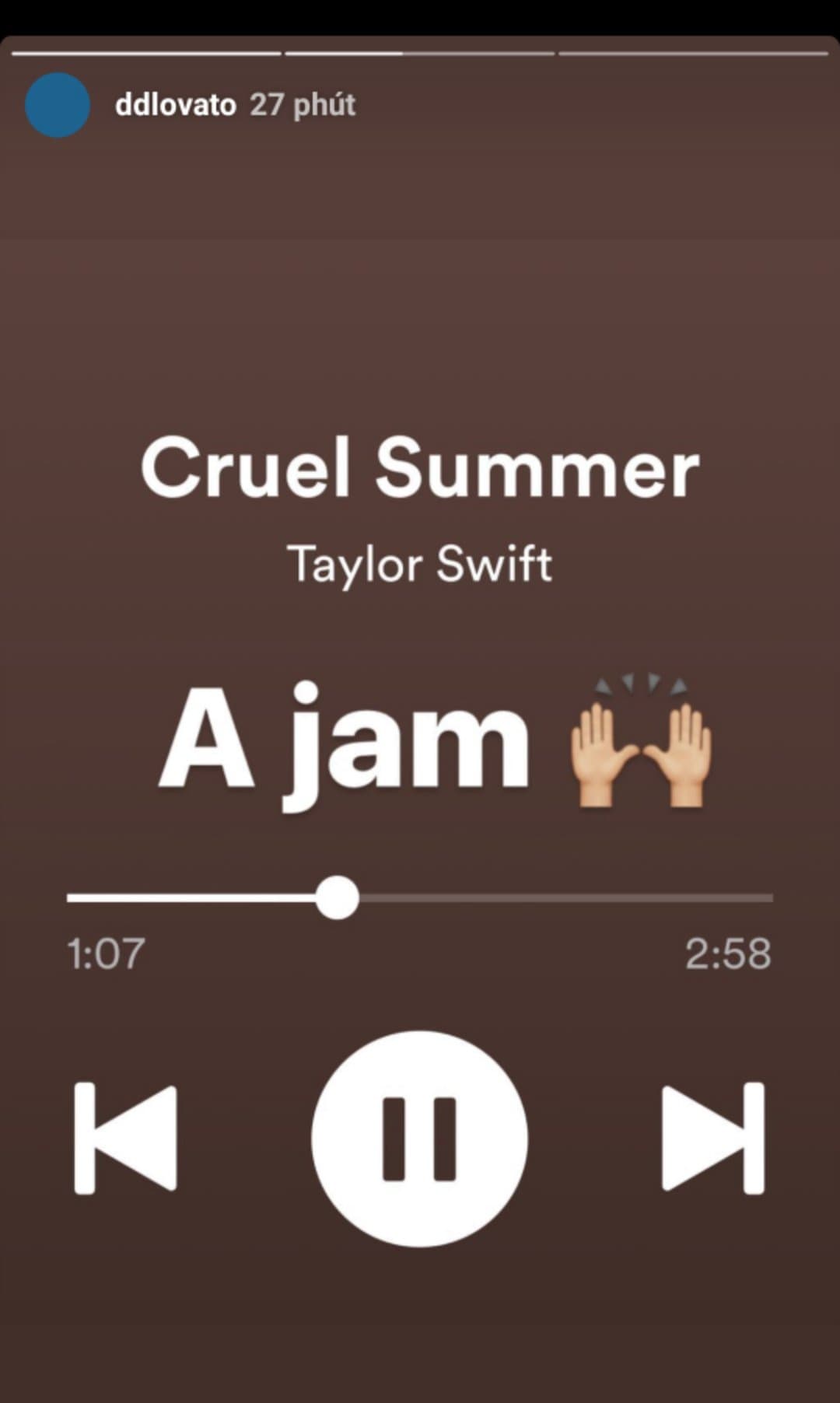 Mới đây, “Drama Queen” Demi Lovato lại một lần nữa làm dậy sóng cộng đồng mạng với phát ngôn mới nhất của mình, đặc biệt nữ ca sĩ còn kéo cả Taylor Swift vào câu chuyện. Cụ thể, Demi Lovato chia sẻ trên story Instagram của mình rằng cô ấy đang mê mệt ca khúc Cruel Summer của Taylor Swift và sẵn sàng ủng hộ âm nhạc từ “bướm chúa”.
