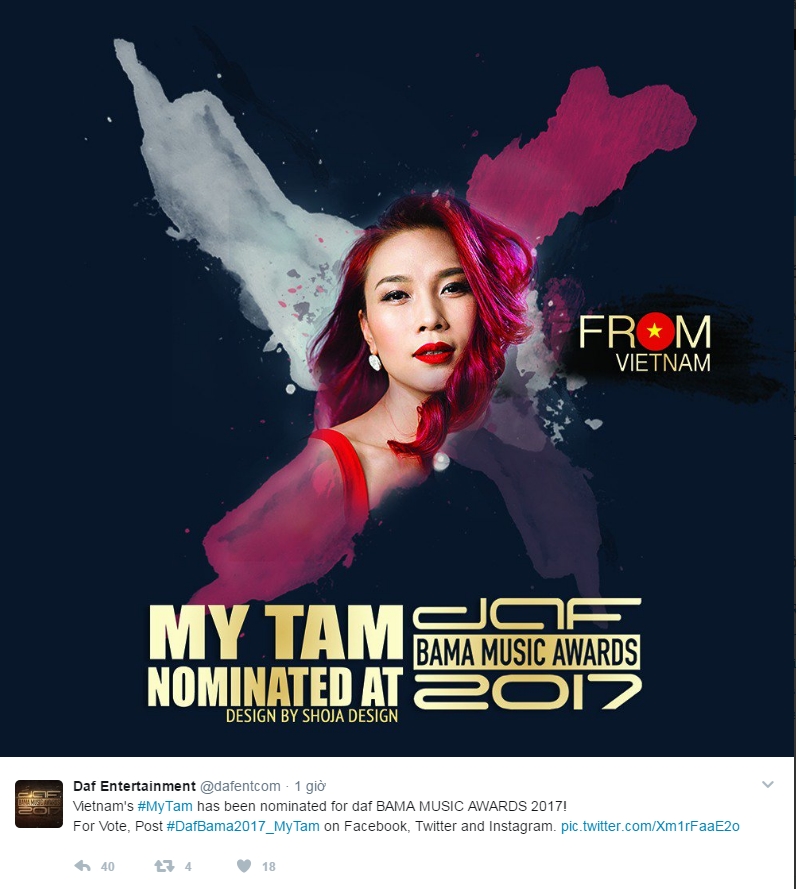 Mỹ Tâm “may mắn” được đề cử tại BAMA 2017. Tuy nhiên giải gì thì không biết. Fan cứ vote đi đã nhé!