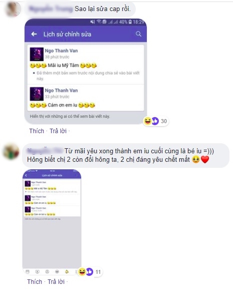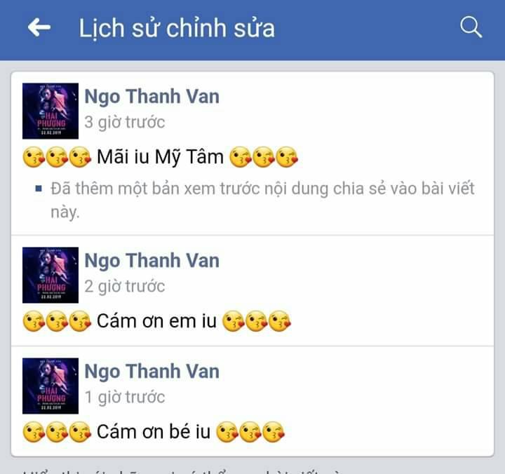 Cụ thể, ở dòng trạng thái ban đầu, “chị Phượng” đã viết “Cảm ơn Mỹ Tâm”. Tuy nhiên chỉ khoảng 1 tiếng sau, “đả nữ” đã chỉnh sửa thành “Cảm ơn em iu” và cuối cùng, cách “chắc ăn” nhất để thể hiện tình cảm, Ngô Thanh Vân đã quyết định “chốt” dòng trạng thái thái của mình là: “Cảm ơn bé iu”.
