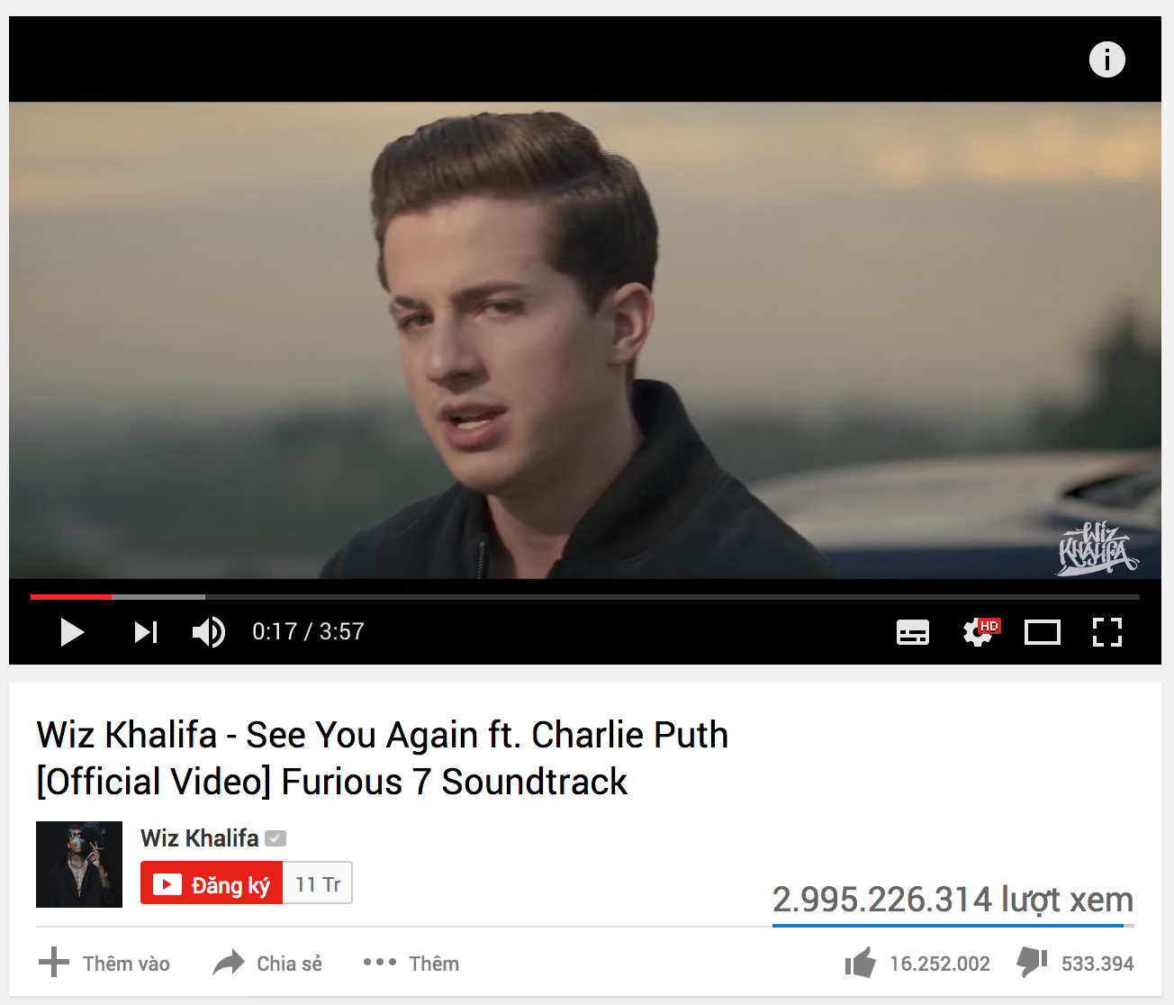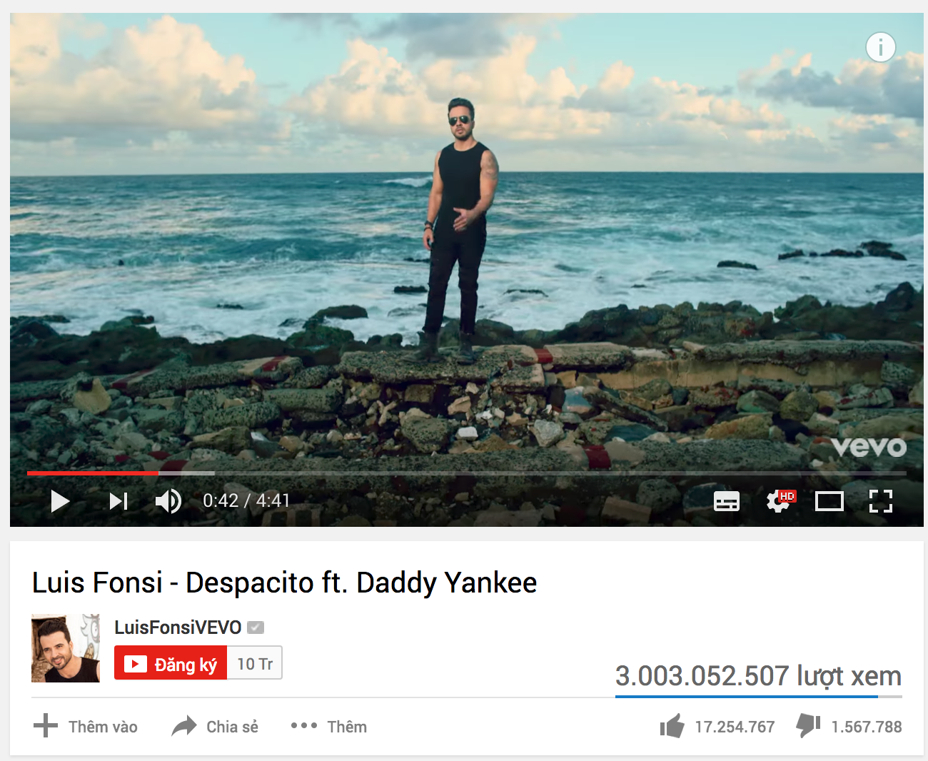 Sau gần 7 tháng ra mắt, Despacito của bộ đôi Luis Fonsi và Daddy Yankee đã chính thức vươn lên dẫn đầu BXH âm nhạc thế giới về lượt xem MV, trở thành siêu hit mọi thời đại khi đá đổ See You Again vào đúng thời khắc chạm mốc 3 tỷ view (cũng là ca khúc đầu tiên làm được điều này).