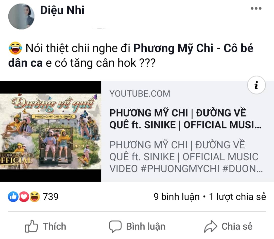 Cụ thể, trên trang Facebook cá nhân, Diệu Nhi đã chia sẻ MV mới nhất của Phương Mỹ Chi cùng dòng caption dễ gây “hoang mang”: “Nói thiệt chị nghe đi Phương Mỹ Chi, em có tăng cân phải không?”. Một lần nữa Diệu Nhi lại khiến cho khán giả phải bật cười vì sự hài hước của mình, ủng hộ đàn em là thế nhưng bản chất vẫn không quên… cà khịa, thể hiện sự “không bằng lòng” với sản phẩm này. Chắc chắn bản thân Phương Mỹ Chi sau khi nhận được sự chia sẻ đầy cảm xúc từ Diệu Nhi thì cũng không biết nên vui hay nên buồn.
