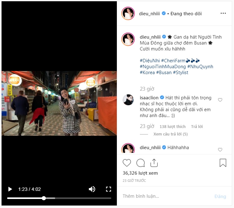 Mới đây, Diệu Nhi đã “gan dạ” đăng tải đoạn clip thể hiện ca khúc Người tình mùa đông ngay giữa chợ đêm Busan, Hàn Quốc. Với bản tính “lầy” khó ai bằng, chẳng trách mà đoạn clip cover này khiến người xem cứ thế mà “cười quặn ruột”. Dù thể hiện những giai điệu nhẹ nhàng là thế nhưng Diệu Nhi cũng khiến cho du khách quốc tế đi đường không khỏi chú ý. Thậm chí, họ còn phải “nhường sân” cho Diệu Nhi để cô nàng có thể thỏa mãn niềm đam mê của mình.