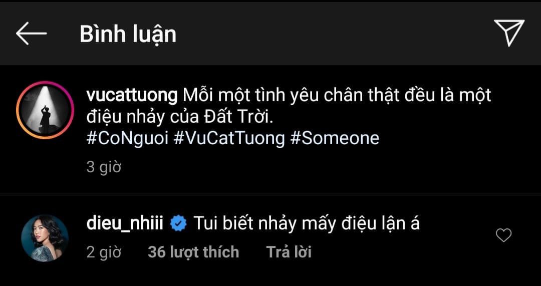 Cũng không phải tự nhiên mà có ý kiến cho rằng Diệu Nhi đang “lăm le” cover nhạc của đàn chị khi mà trước đó, điều tương tự đã từng xảy ra với Vũ Cát Tường. Thời điểm Vũ Cát Tường đang trong giai đoạn quảng bá ca khúc Có người, Diệu Nhi đã nhiều lần vào bài đăng của nữ ca sĩ để… bày tỏ tình cảm. Và quan trọng hơn hết là sau những bình luận đó, Có người phiên bản từ Diệu Nhi ra đời đã khiến nhiều người cảm thấy mệt mỏi.