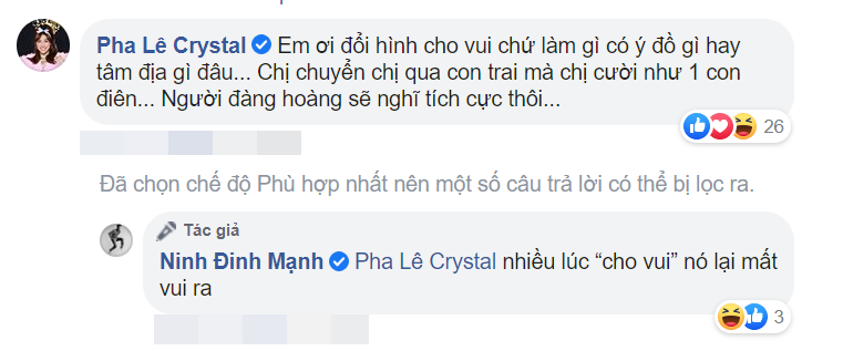 Bài chia sẻ của Đinh Mạnh Ninh sau đó đã nhận về nhiều sự quan tâm từ bạn bè, đồng nghiệp. Một số ý kiến đồng tình nhưng cũng không thiếu người cho rằng hành động này đơn giản chỉ là tò mò muốn được xem khuôn mặt của mình trong giới tính khác sẽ như thế nào. Nữ ca sĩ Pha Lê thậm chí còn khá gay gắt: “Em ơi đổi hình cho vui chứ làm gì có ý đồ gì hay tâm địa gì đâu. Chị chuyển chị qua con trai mà chị cười như 1 con điên. Người đàng hoàng sẽ nghĩ tích cực thôi”.