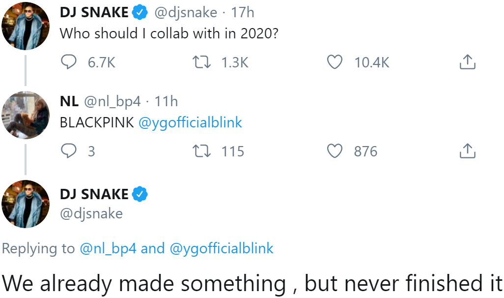 Ngày 19/1, DJ Snake đăng 1 đoạn tweet “trưng cầu ý dân” về việc nên hợp tác cùng với nghệ sĩ nào trong năm mới này. Đã có rất nhiều gợi ý được đưa ra cho chàng DJ người Pháp này. Trong đó, đáng chú ý, khi có người nhắc BlackPink, anh bất ngờ tiết lộ: “Chúng tôi đã làm được chút gì đó cùng nhau, nhưng chưa bao giờ có thể hoàn tất được“.