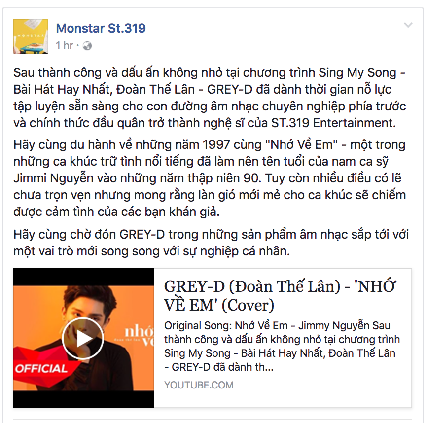 Sau một thời gian hot boy Đoàn Thế Lân bước ra từ cuộc thi Sing My Song với nhiều dấu ấn cá nhân, trước nhiều tin đồn úp mở về việc anh chàng sẽ đầu quân về ST.319 Entertainment, mới đây nhất, trên trang fanpage của MONSTAR đã chính thức xác nhận thông tin này. Đây là một tin vui dành cho người hâm mộ GREY-D (nghệ danh Thế Lân sẽ sử dụng khi hoạt động tại ST.319)