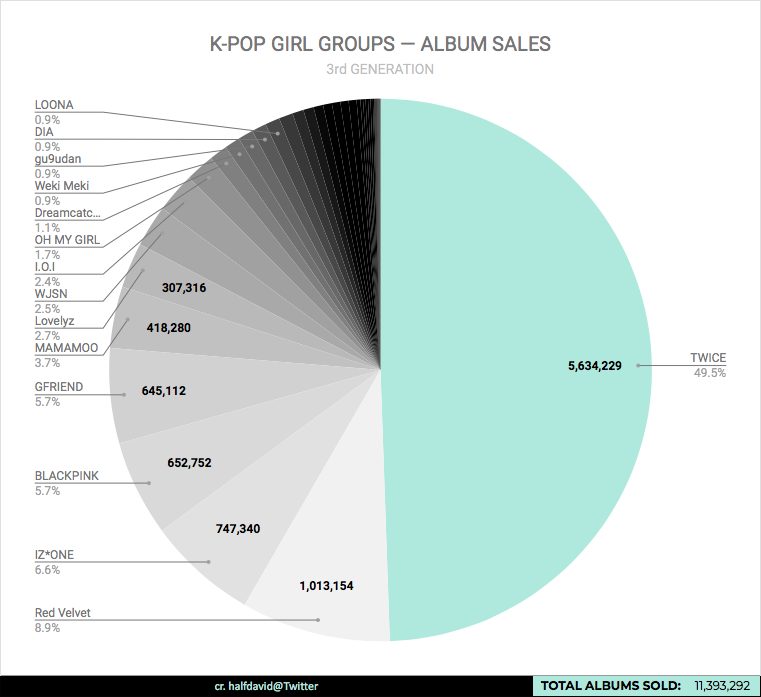 Mới đây, một biểu đồ hình tròn mô tả doanh số album nhóm nữ thế hệ 3 của K-Pop đang được lan truyền rộng rãi trên Twitter. Biểu đồ này được thống kê dựa vào số liệu được cập nhật trên Gaon tháng 4/2019 và Oricon tuần 17, bao gồm tất cả cả các girlgroup hoạt động từ năm 2014 - 2019. Quả không nằm ngoài dự đoán, TWICE là nhóm nữ thế hệ 3 thống trị bảng xếp hạng. Nhưng điều khiến người hâm mộ bất ngờ là lượng album bán ra của TWICE bằng tổng tất cả các nhóm nữ khác cộng lại, và cái tên đình đám như BlackPink cũng chỉ xếp sau đàn em IZ*ONE.