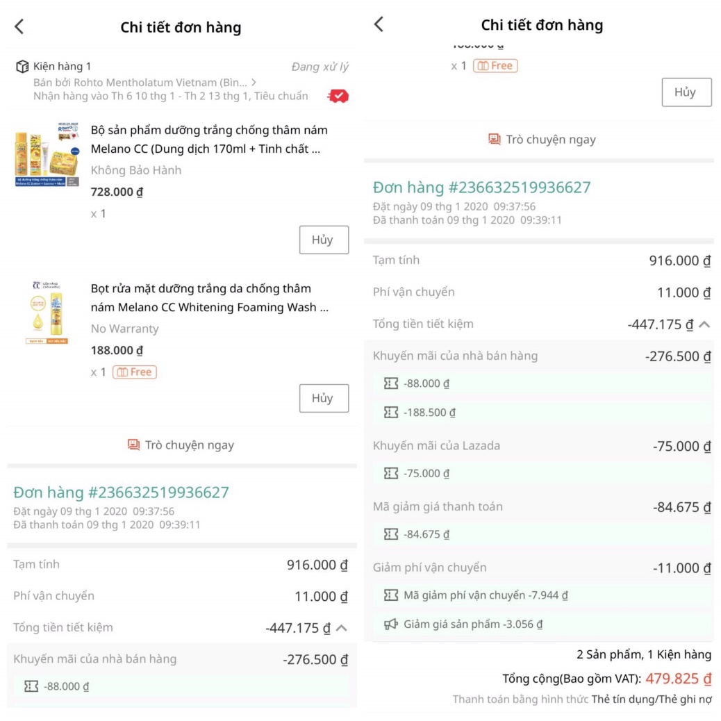 Một đơn hàng thực tế khi mua sắm trên Lazada dịp Tết năm nay. Khách hàng sẽ được cộng dồn ưu đãi từ cả nhà bán hàng và Lazada.