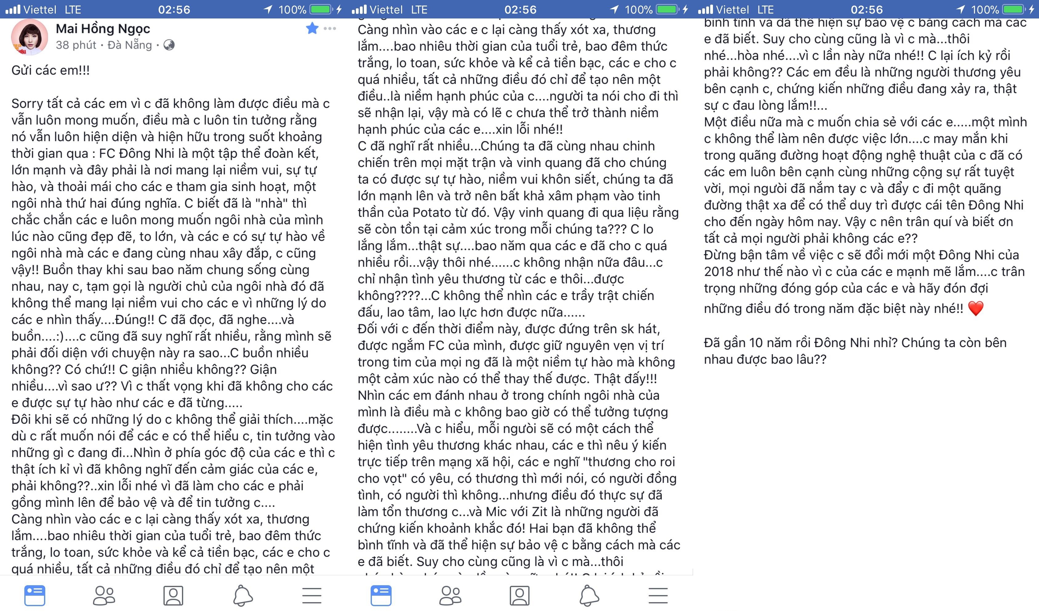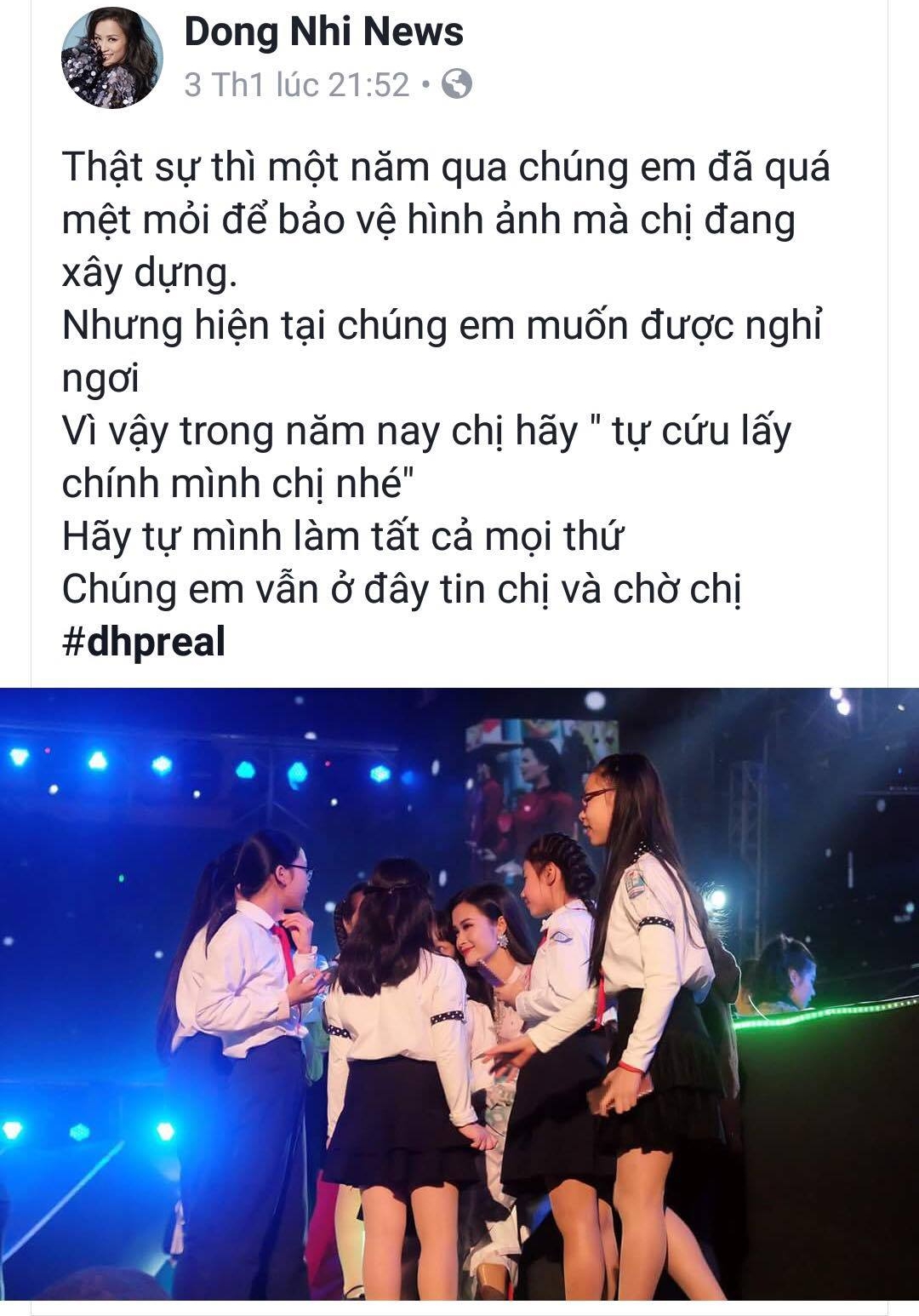 Thời gian qua chắc chắn là những ngày sóng gió đối với các Potatoes (cộng đồng fan Đông Nhi) khi họ vừa phải trải qua một cơn “khủng hoảng” nội bộ, một fanpage lớn của nữ ca sĩ đã đăng status muốn tạm dừng lại vì quá mệt mỏi khi thần tượng không chịu thay đổi hay lắng nghe ý kiến đóng góp từ người hâm mộ. Chứng kiến cuộc chiến không thể ngờ đến ngay trong FC mình, Đông Nhi đã phải đau lòng lên tiếng bằng một bức tâm thư trên trang cá nhân gửi đến fan.
