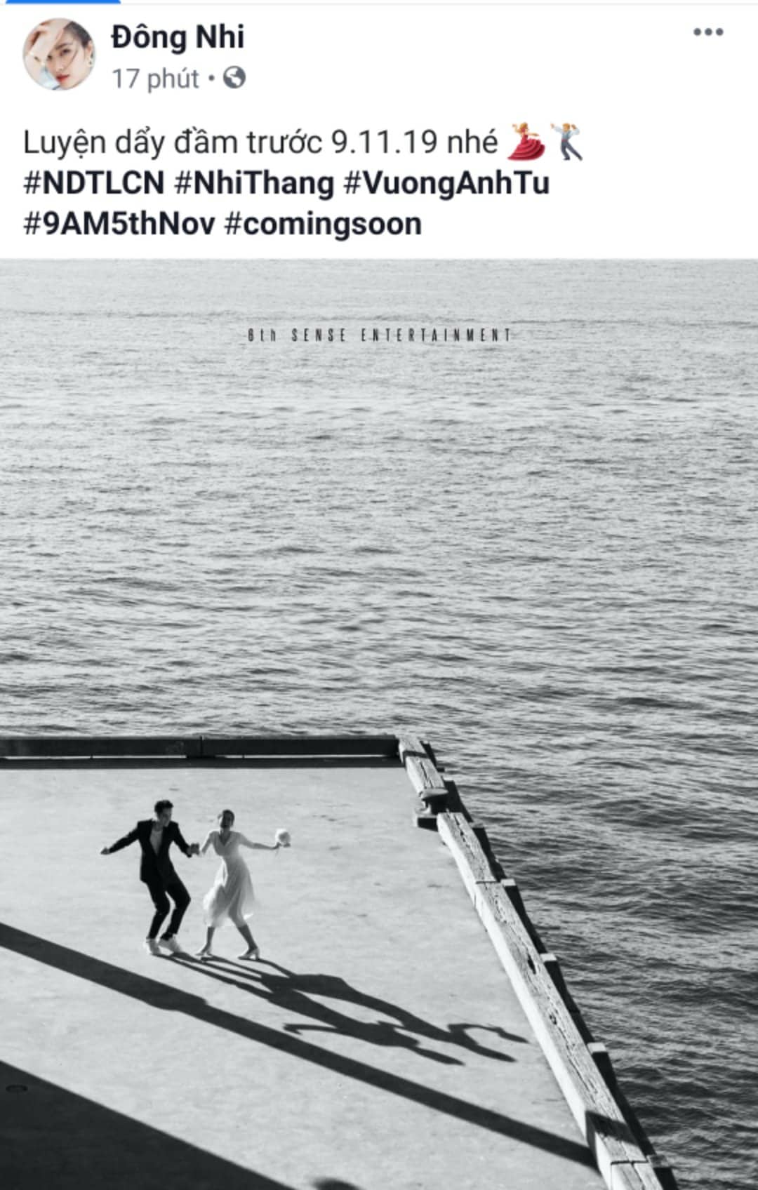 Trong khi những thông tin chi tiết về lễ cưới với Ông Cao Thắng vẫn đang khiến cho nhiều người vô cùng tò mò thì mới đây, Đông Nhi lại bất ngờ “đánh úp” khán giả với một màn “thả thính” khá xịn. Cụ thể, trên trang cá nhân của mình, Đông Nhi đã đăng tải một tấm poster trắng đen, nữ ca sĩ xuất hiện cùng Ông Cao Thắng vô cùng nhắng nhít trên một bến thuyền giữa đại dương mênh mông. Đi kèm đó là dòng caption “đậm đà” mùi hương của sản phẩm mới: “Luyện dẩy đầm (nhảy đầm) trước 9/11/2019 nhé” và một loạt các hashtag #NDTLCN #NhiThang #VuongAnhTu #9AM5thNov # comingsoon.