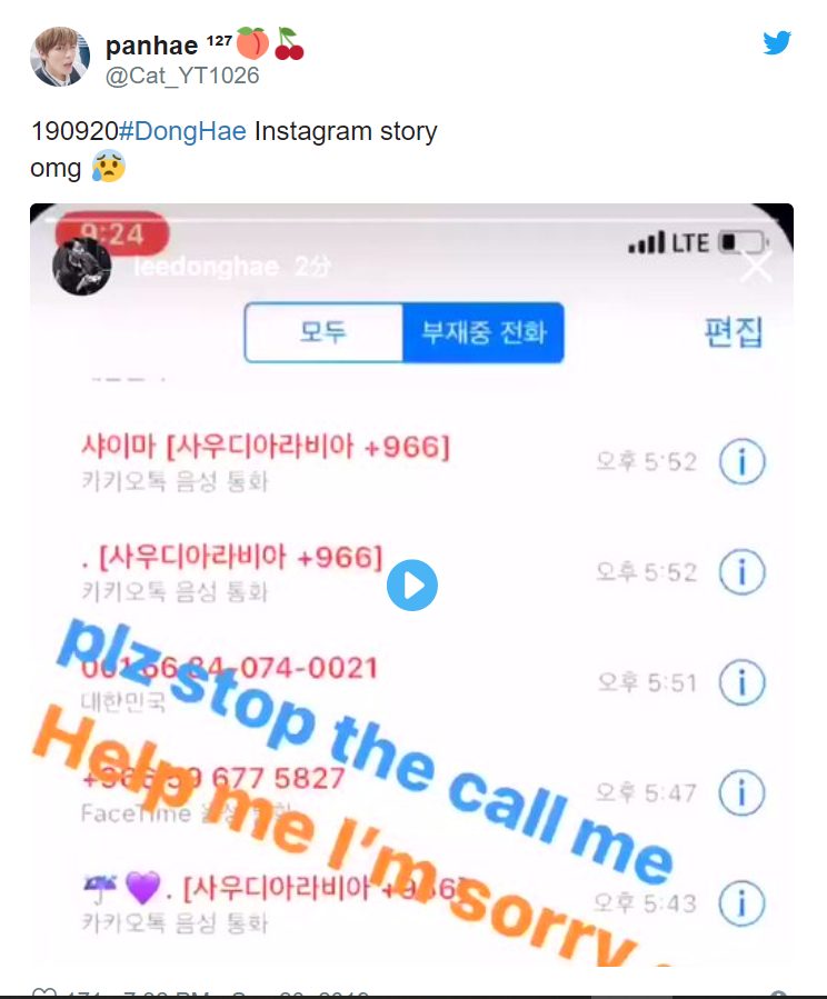 Mới đây, thành viên Donghae của nhóm nhạc Super Junior đã bất ngờ có trạng thái khó chịu trên mạng xã hội vì liên quan đến fan cuồng. Cụ thể, nam ca sĩ đã chia sẻ hình ảnh chụp lại nhật ký cuộc gọi gần nhất trong điện thoại của mình và chia sẻ lên story instagram với dòng caption: “Làm ơn hãy ngừng lại đi. Ai đó hãy giúp tôi, làm ơn”. Với hàng chục cuộc gọi liên tục được thực hiện từ cùng một số, Donghae cho biết mình đang cảm thấy vô cùng mệt mỏi vì việc này.