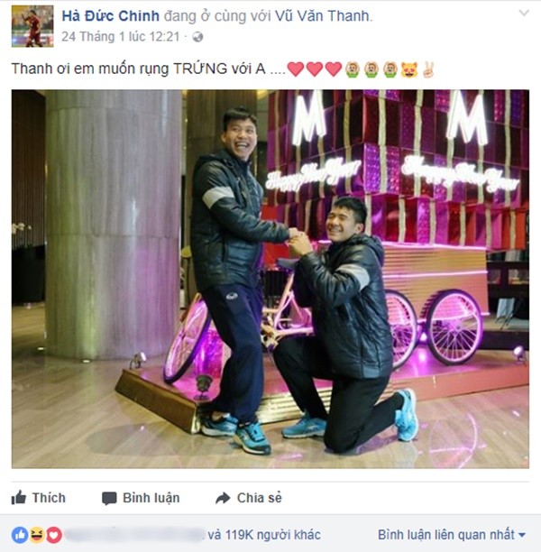 Được coi như “bạn trai quốc dân’’ nên dễ hiểu vì sao lúc này, từng động thái của các chàng U23 Việt Nam đều nhận sự ‘’săm soi’’ cực kỹ lưỡng. Khi Hồng Duy e thẹn cầm micro: “Lời đầu tiên em xin gửi đến quý khán giả và người hâm mộ lời chào trân trọng nhất” thì Hà Đức Chinh phía sau vô tư cất tiếng trêu chọc: “Làm như ca sĩ mà trân trọng nhất”. Chắc hẳn là trong cơn hò reo của hơn 40.000 cổ động viên, Hồng Duy sẽ chẳng nghe được những gì cậu em lém lỉnh bông đùa và Đức Chinh cũng không ngờ tiếng của mình lại “lọt’’ vào sóng trực tiếp, nhưng cư dân mạng thì luôn tinh ý đấy nhé! Dễ thương vậy bảo sao các fangirl không ”đổ cái rầm” cơ chứ.