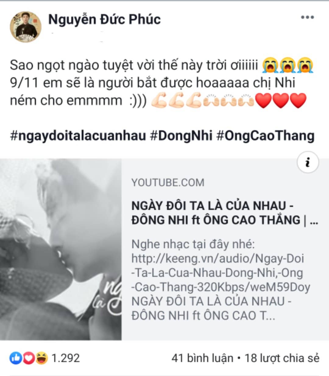 Mới đây trên trang Facebook cá nhân của mình, Đức Phúc đã chia sẻ MV Ngày đôi ta là của nhau với thái độ đầy hứng khởi, không những vậy nam ca sĩ còn khiến fan choáng váng khi tuyên bố sẽ giành bằng được bó hoa trong ngày cưới Đông Nhi và Ông Cao Thắng. Cụ thể, Đức Phúc cho biết: “Sao ngọt ngào tuyệt vời thế này trời ơi. 9/11 em sẽ là người bắt được hoa chị Nhi ném cho em“. Trong khi những ngày vừa qua, không ít đồng nghiệp trong showbiz đang mong muốn đặt được một suất trình diễn giúp vui tại đám cưới của Đông Nhi và Ông Cao Thắng thì ước nguyện của Đức Phúc nghe thật thú vị.