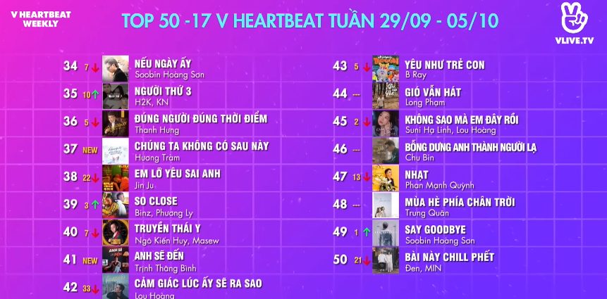 Trở lại với BXH V Heartbeat Rank ở thứ hạng 50 đến 34, có nhiều ca khúc đang thăng hạng như So Close (Binz - Phương Ly), Say Goodbye (Binz - Phương Ly). Tuần này, cũng có nhiều ca khúc mới xuất hiện như Chúng ta không có sau này, Anh sẽ đến (Trịnh Thăng Bình). Tuy nhiên, lại có một số ca khúc bị tụt hạng như Nếu ngày ấy, Đúng người đúng thời điểm hay Em lỡ yêu sai anh…