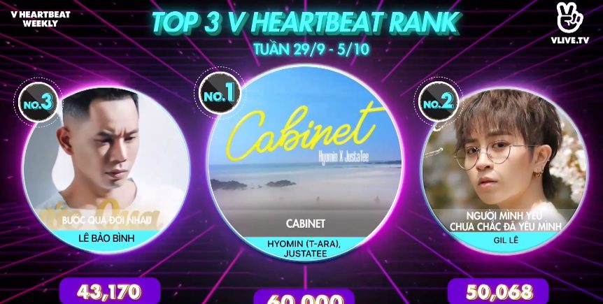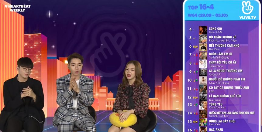 Vừa qua, chương trình V HEARTBEAT Weekly với sự dẫn dắt của hai MC Leo (Zero 9) - Liz Kim Cương (LIME) đã lên sóng, công bố TOP50 ca khúc trên BXH V HEARTBEAT Rank.