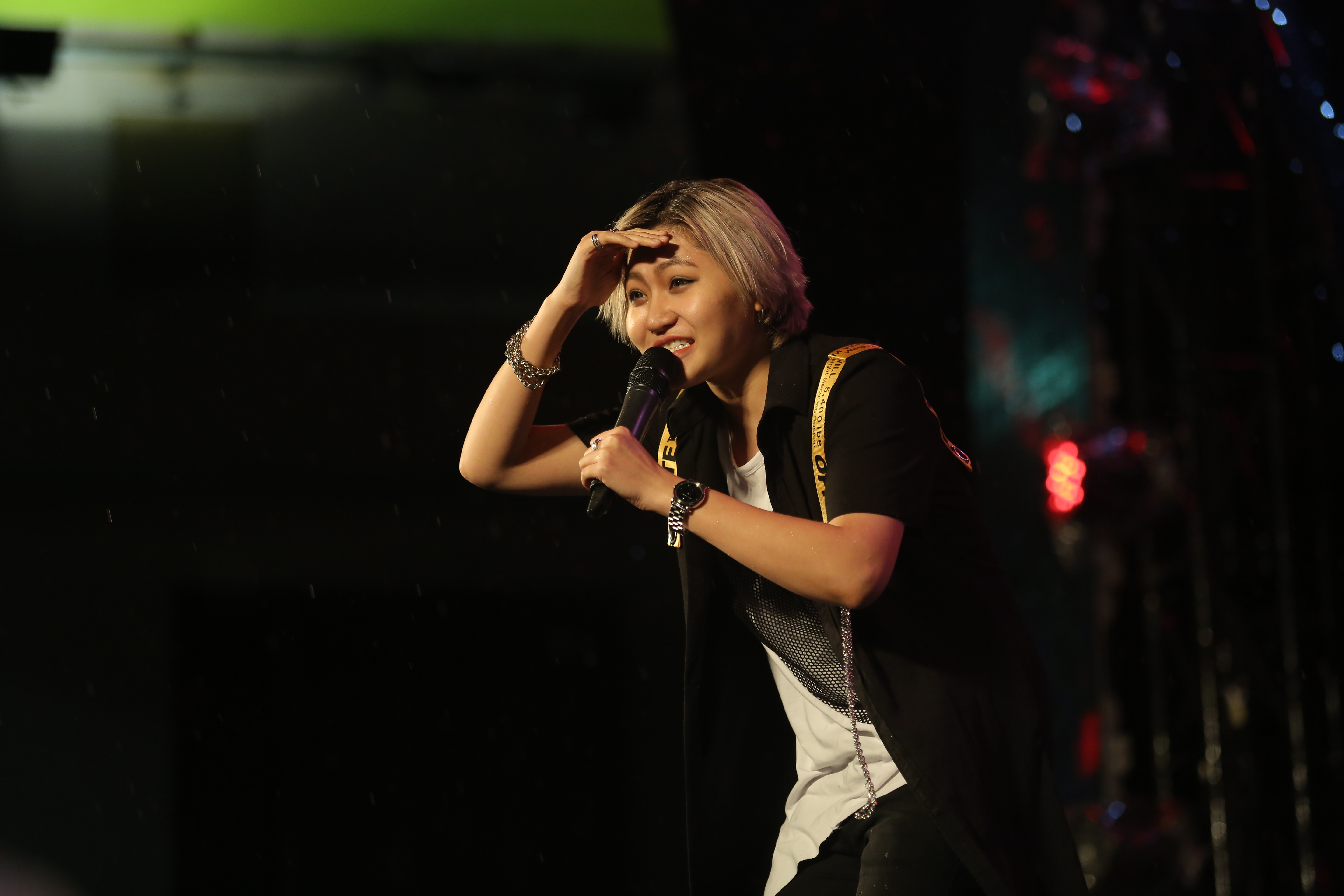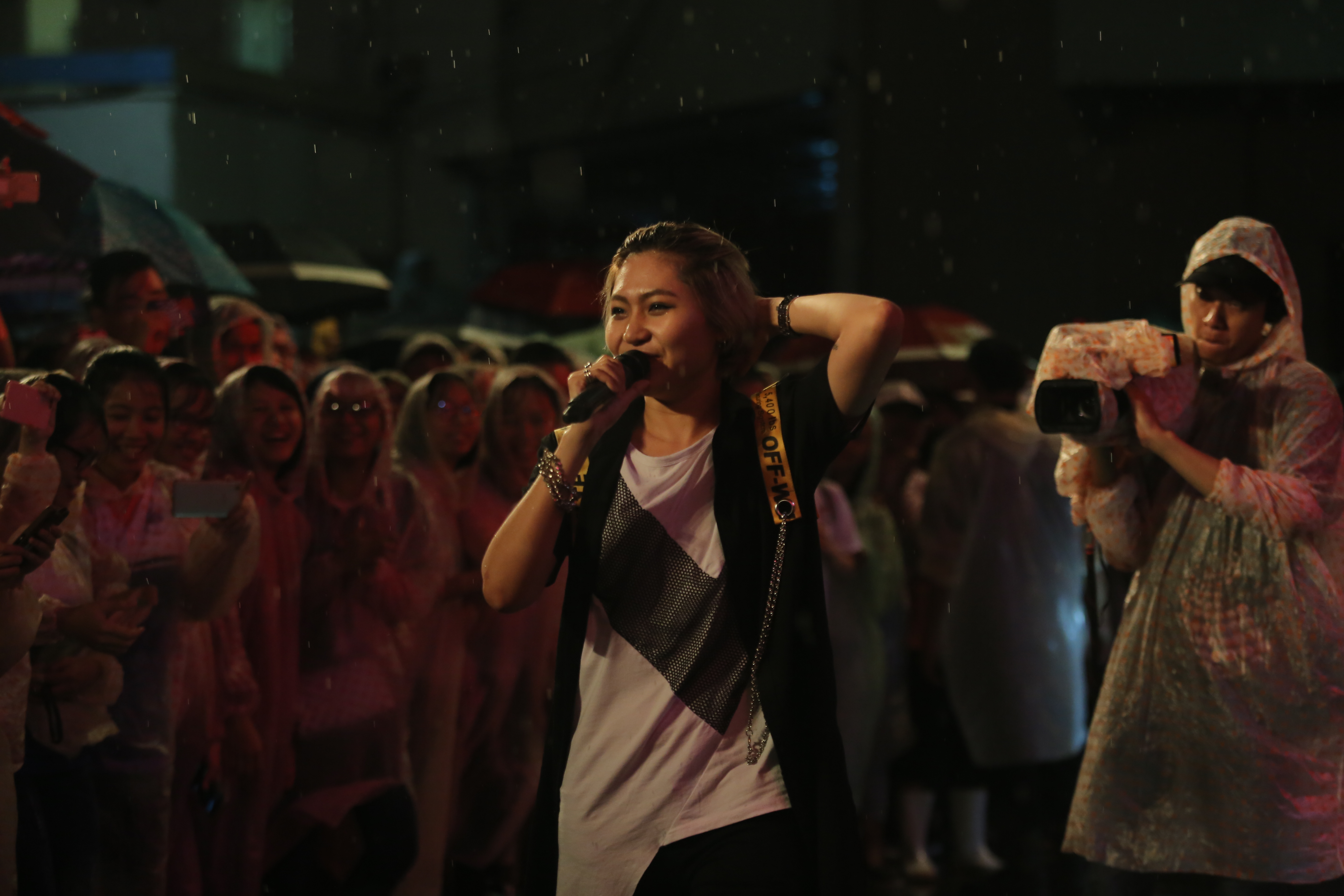 Nữ ca sĩ cá tính di chuyển xuống giao lưu cùng người hâm mộ mặc cơn mưa tầm tã.