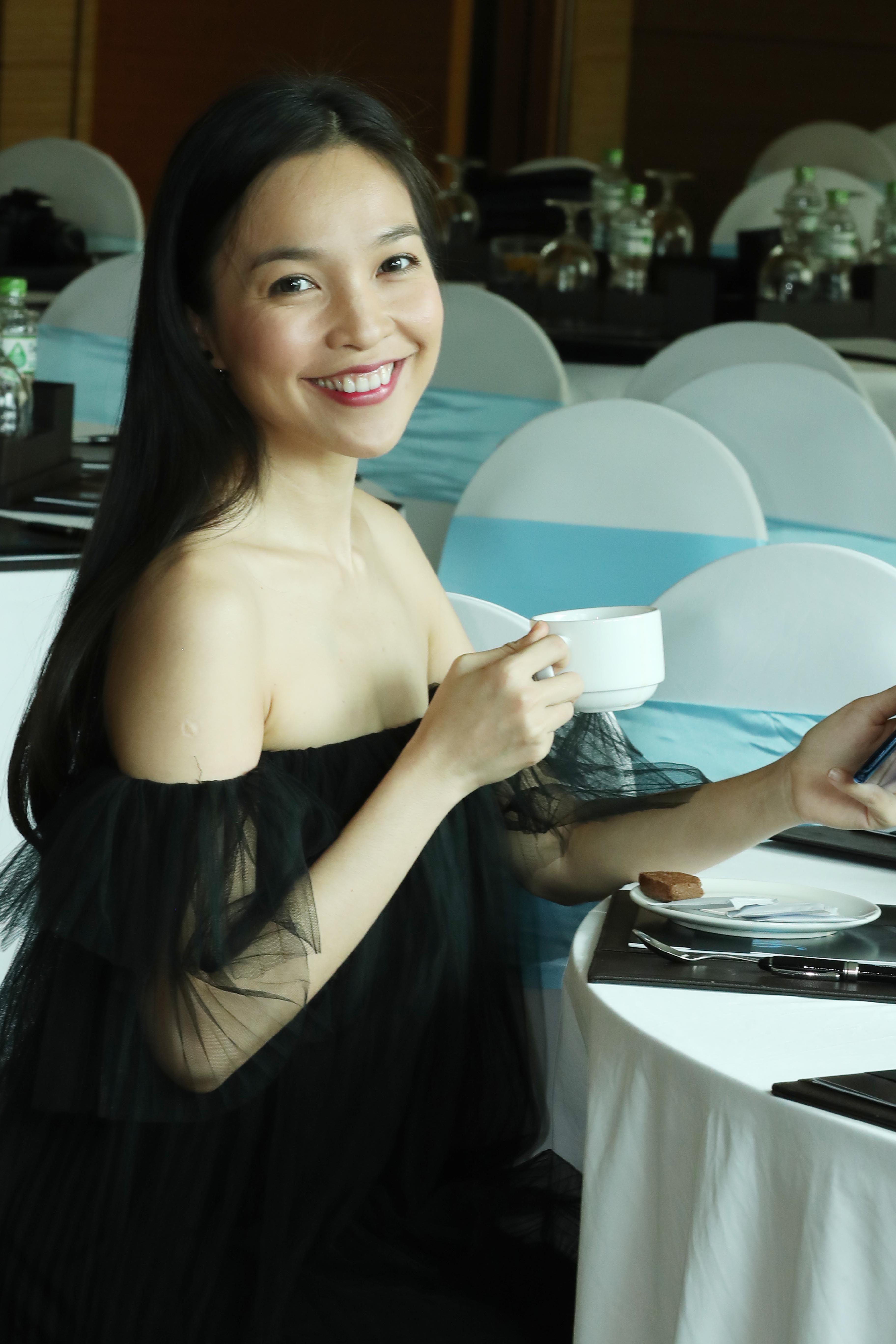 Hiền Thục diện váy trễ vai điệu đà tới chúc mừng đồng nghiệp.